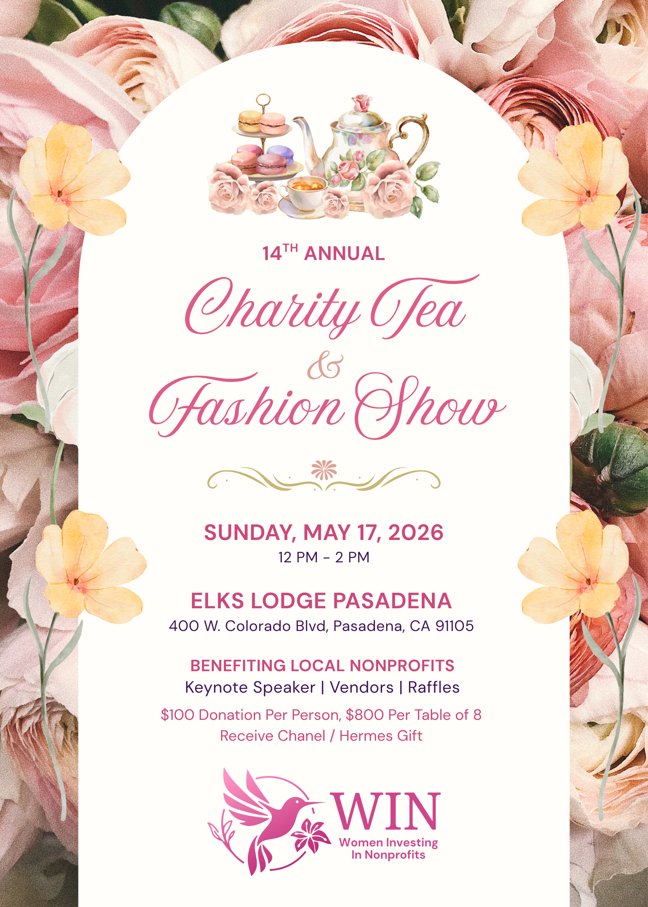 Join us for a delightful Sunday afternoon with elegant tabletops, exquisite tea sets, stunning dresses and hats! The fun Annual Tea features vendors, keynote speaker, silent auction, and captivating fashion show. May 17, 2026 at Elks Lodge Pasadena, 12-2:30pm. Tickets are $100 donation per person, $800 for a table of eight.